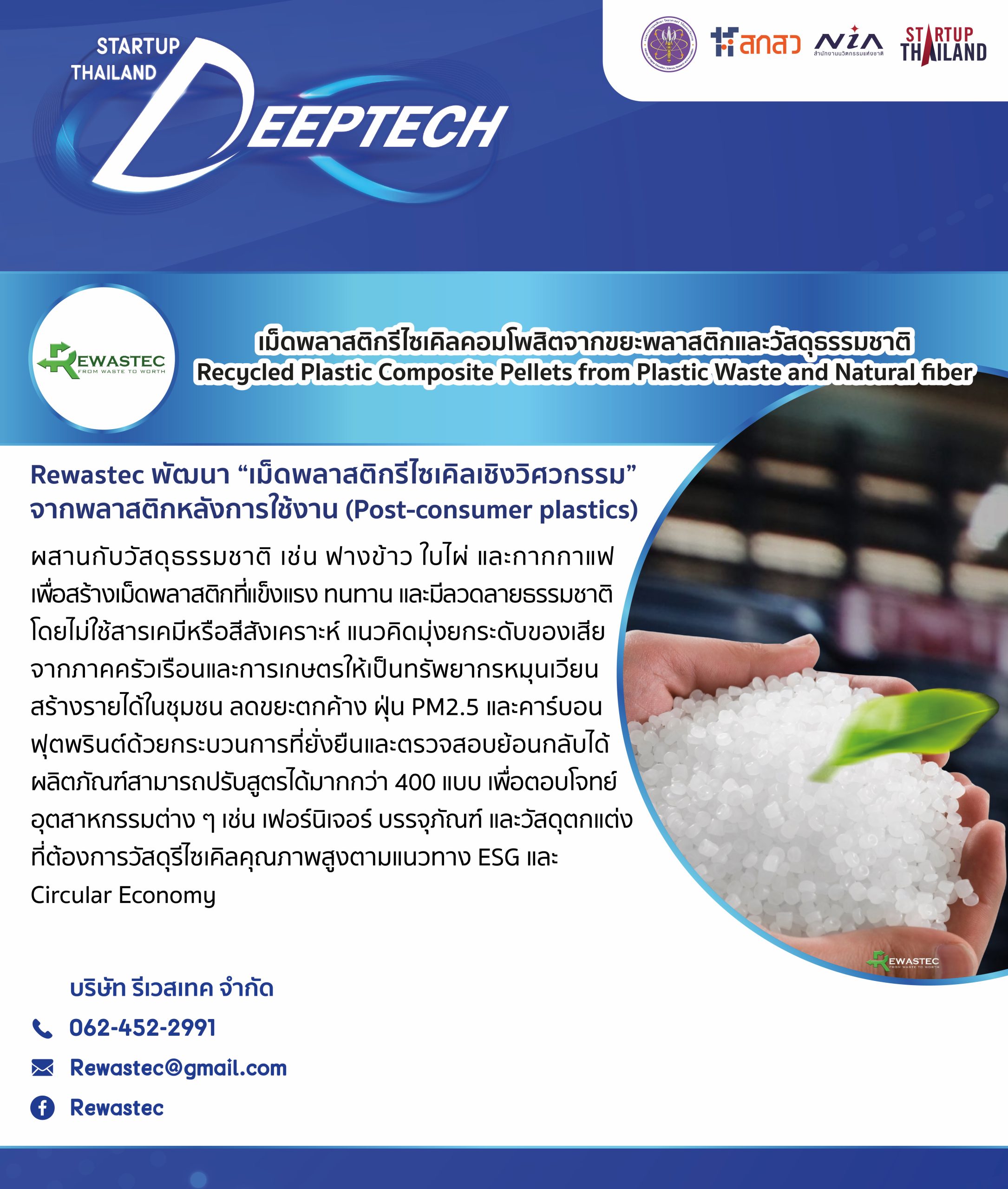 ในยุคที่ความยั่งยืน (Sustainability) และเศรษฐกิจหมุนเวียน (Circular Economy) เป็นวาระเร่งด่วนของโลก บริษัท รีเวสเทค จำกัด (Rewastec) สตาร์ตอัป Deep Tech ด้าน Biotech ได้ก้าวเข้ามาเป็นผู้เล่นสำคัญในการสร้างสรรค์นวัตกรรมที่เป็นมิตรต่อสิ่งแวดล้อมอย่างแท้จริง ด้วยผลิตภัณฑ์เรือธงที่น่าจับตาอย่าง “เม็ดพลาสติกรีไซเคิลคอมโพสิตจากขยะพลาสติกและวัสดุธรรมชาติ (Recycled Plastic Composite Pellets from Plastic Waste and Natural Fiber)”