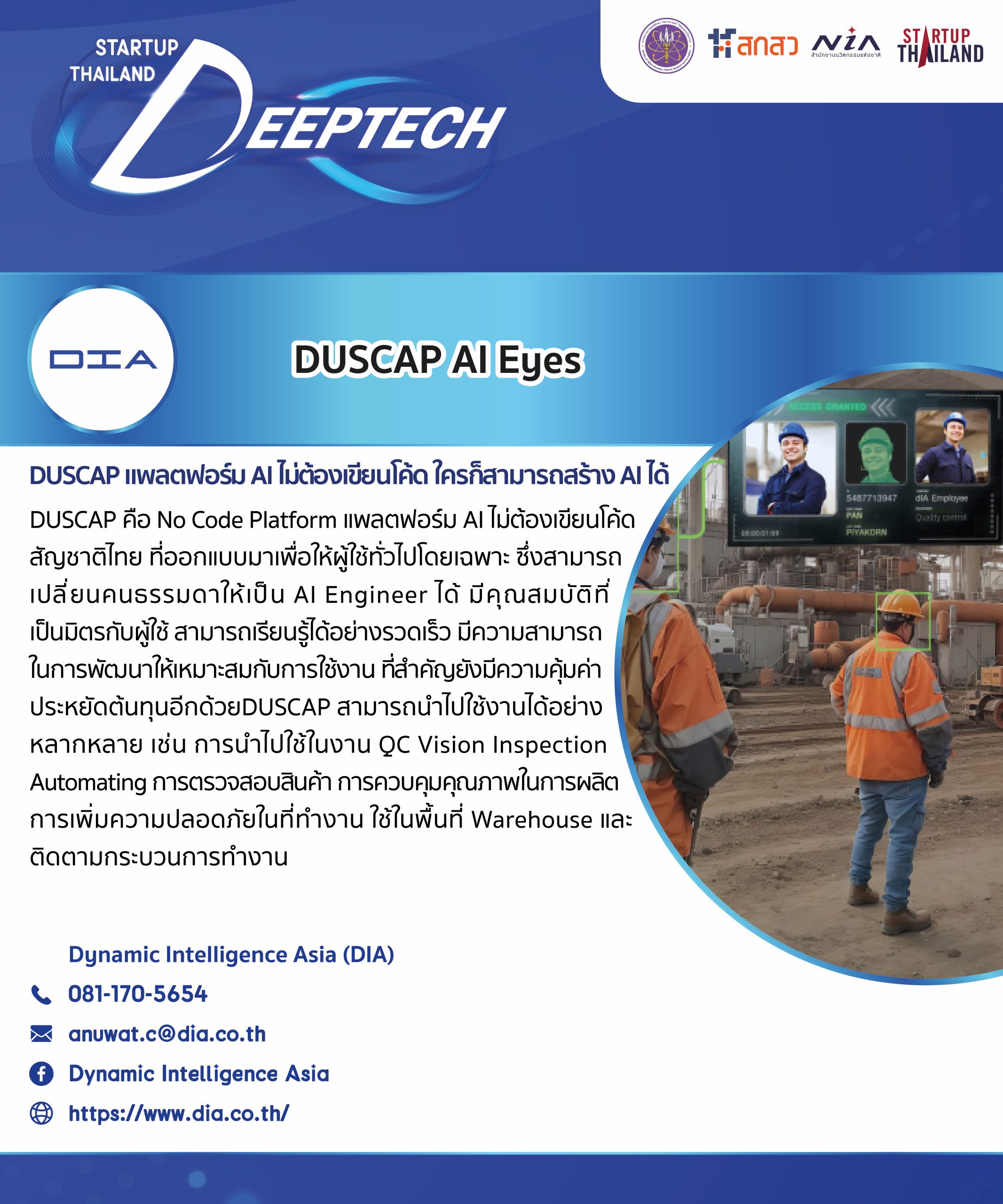 Dynamic Intelligence Asia (DIA) ด้วยผลิตภัณฑ์ DUSCAP AI Eyes จึงเป็นอีกหนึ่งสตาร์ทอัพ Deep Tech ที่น่าจับตามองอย่างยิ่ง ที่กำลังนำเทคโนโลยี AI มาทำให้เป็นเรื่องง่าย เข้าถึงได้ และสร้างความเปลี่ยนแปลงให้กับภาคอุตสาหกรรมไทยอย่างแท้จริง!
