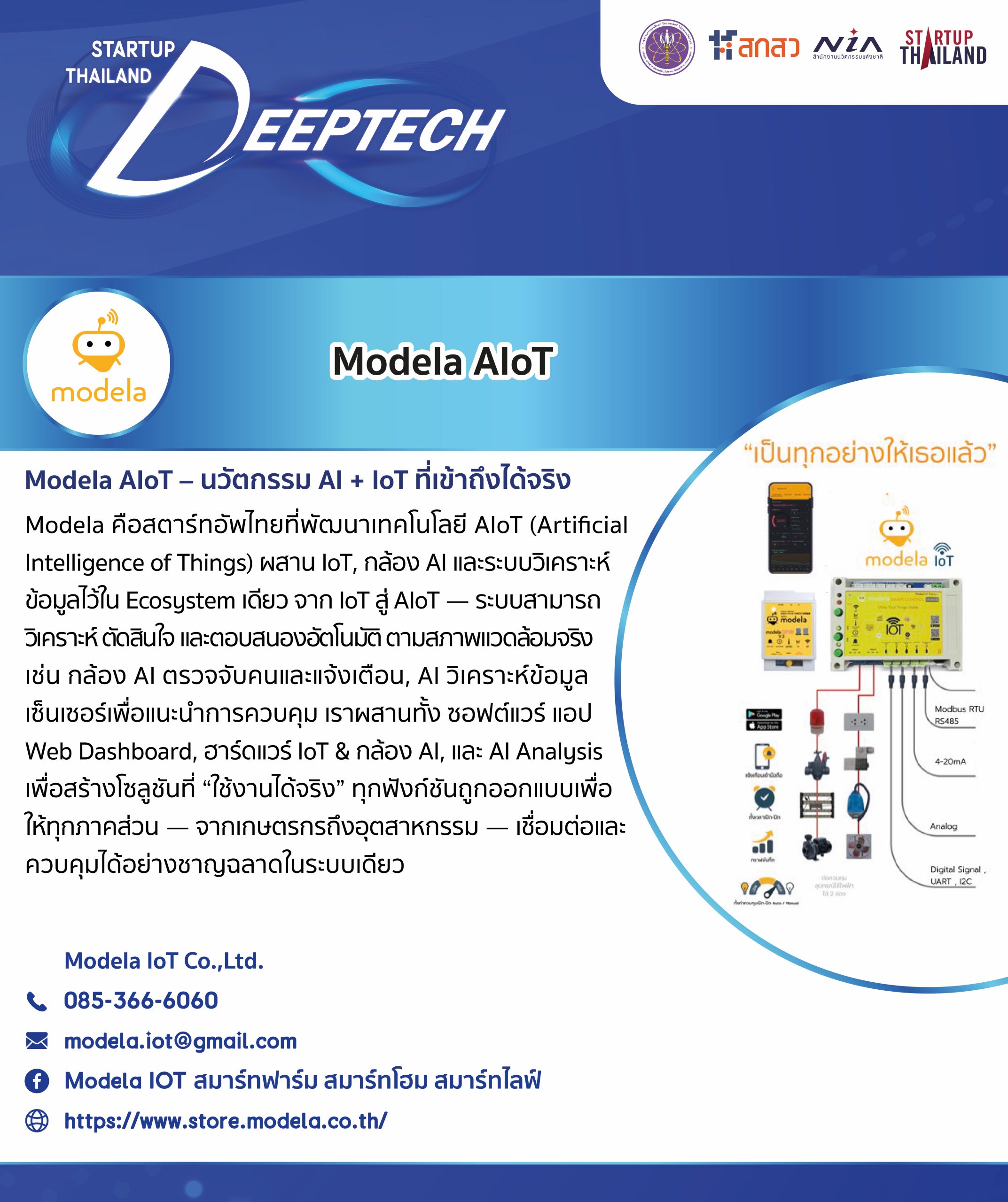 บริษัท โมเดลา ไอโอที จำกัด สตาร์ทอัพไทยด้าน Internet of Things (IoT) ผู้พัฒนาผลิตภัณฑ์ Modela AIoT ที่น่าจับตามอง ได้เข้าร่วมโครงการ Startup Thailand DeepTech 2025 จัดโดยสำนักงานนวัตกรรมแห่งชาติ (NIA) ซึ่งเป็นเวทีสำคัญในการส่งเสริมและพัฒนาวิสาหกิจเริ่มต้นที่ใช้เทคโนโลยีเชิงลึก (Deep Tech) ให้สามารถขับเคลื่อนธุรกิจและขยายตลาดได้อย่างก้าวกระโดด